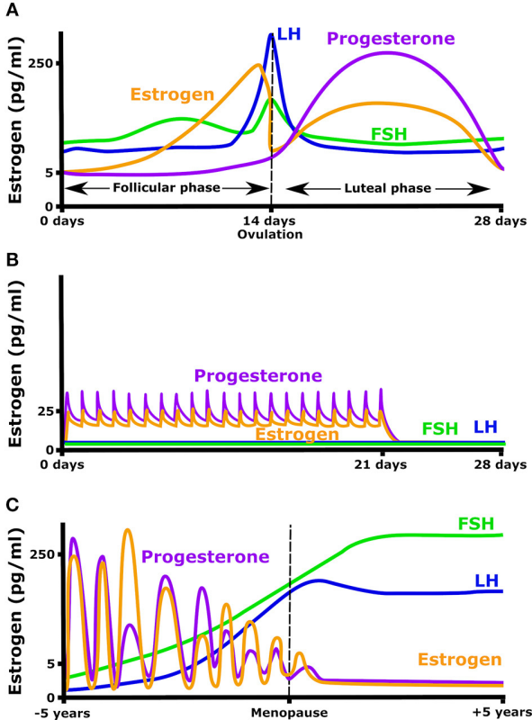 FIGURE 1 | Hormonal fluctuation during (A) a normal menstrual cycle, (B)